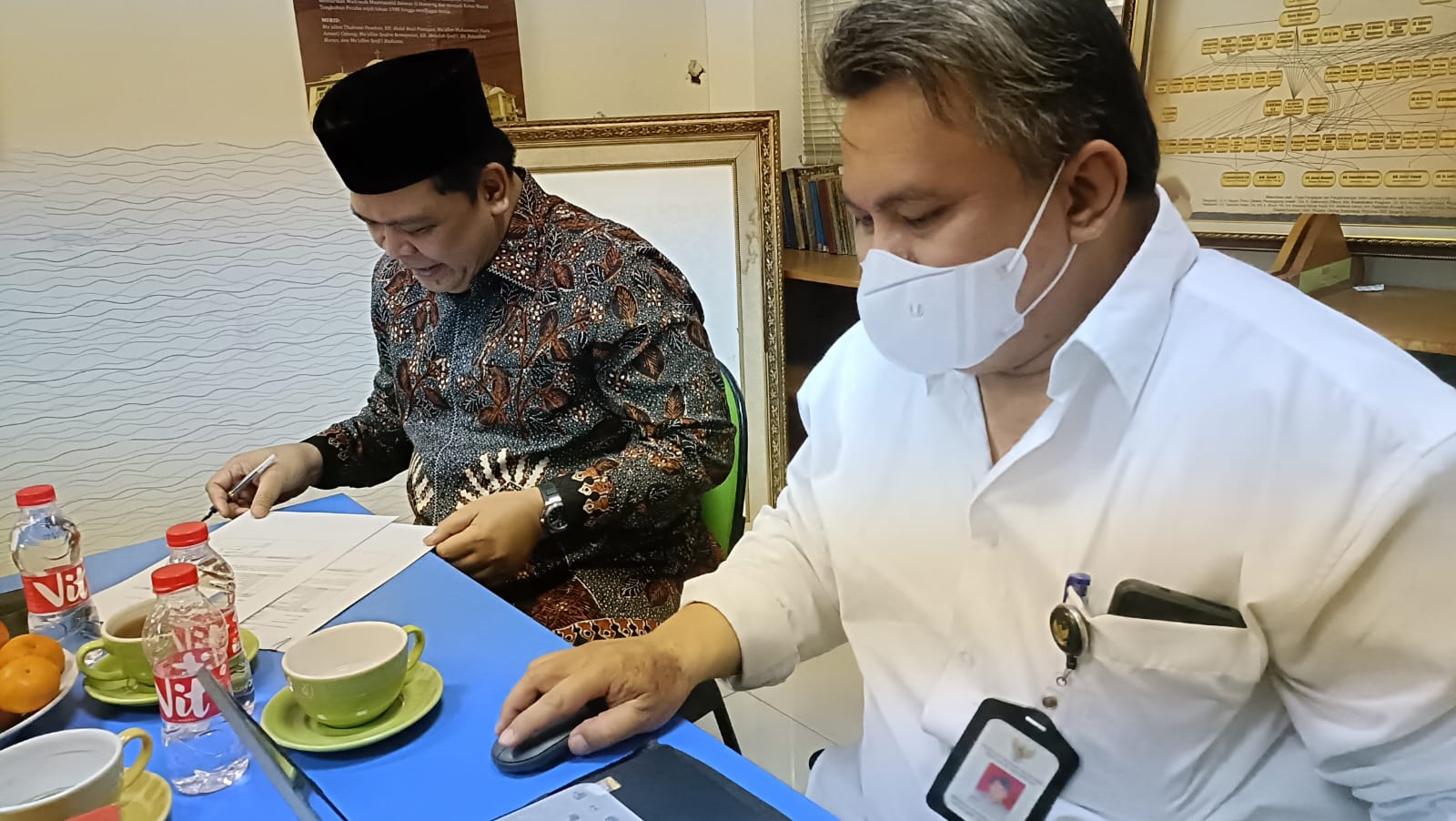 Wakil Kepala PPIJ, Dr. KH. Didi Supandi, Lc, MA (Kiri) dan Asesor Akreditasi Perpustakaan Nasional RI, Renda Kris Artha, M.Si (Kanan) Saat Penandatanganan Hasil dan Rekomendasi Akreditasi